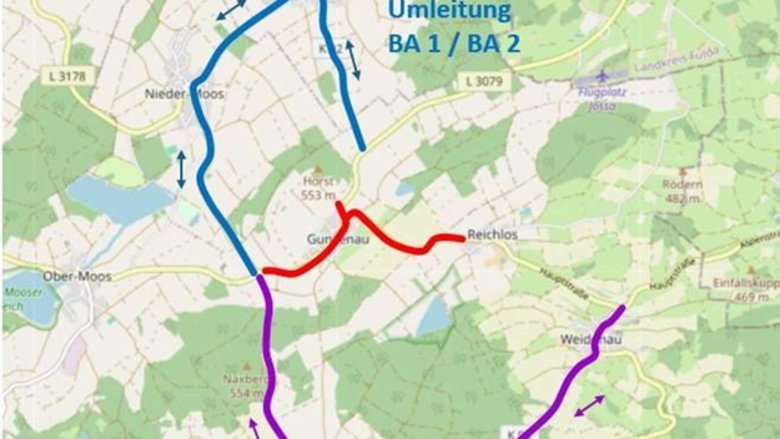 Der Verkehr wird in beiden Richtungen zum einen über Weidenau und Freiensteinau sowie Metzlos und Nieder-Moos umgeleitet. Die Umleitungsstrecken werden entsprechend ausgeschildert.
